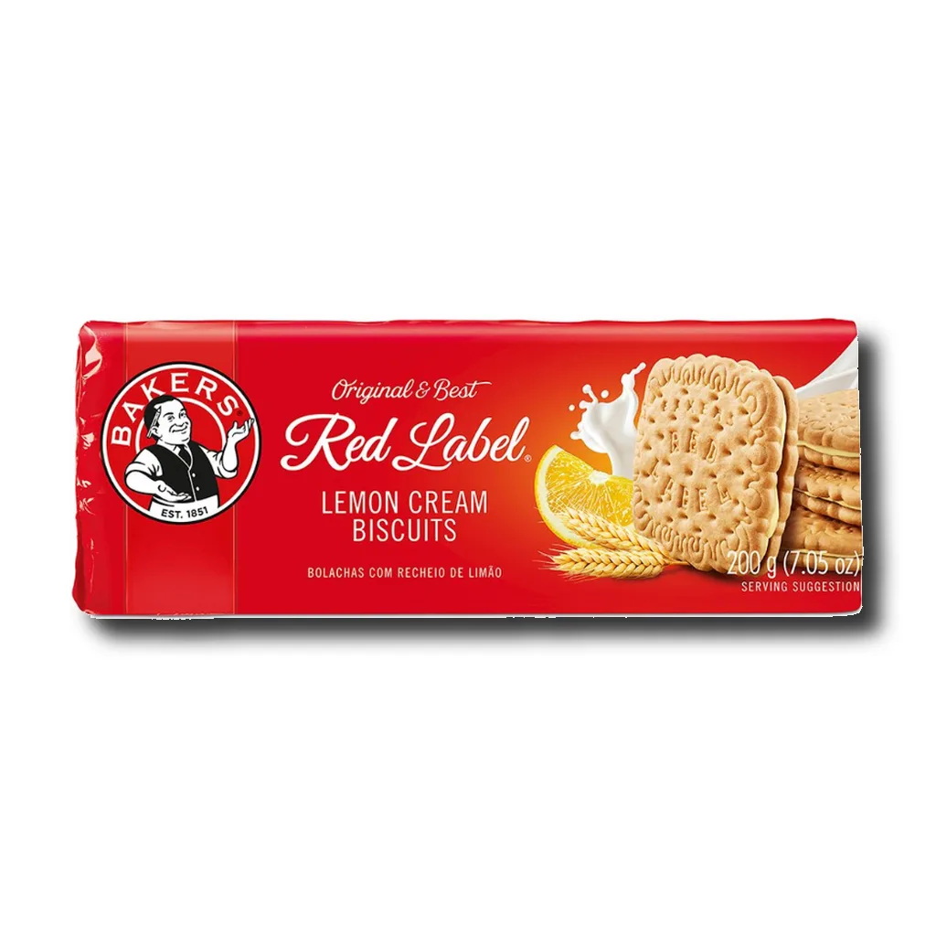 Bakers Red Label Lemon Creams are tangy lemon‑cream sandwich biscuits nestled between two crisp vanilla-flavored cookies. Crafted with real lemon oil, butter, and eggs, these zesty treats offer a delightful snap and citrus zing—perfect with tea or as a shareable snack
