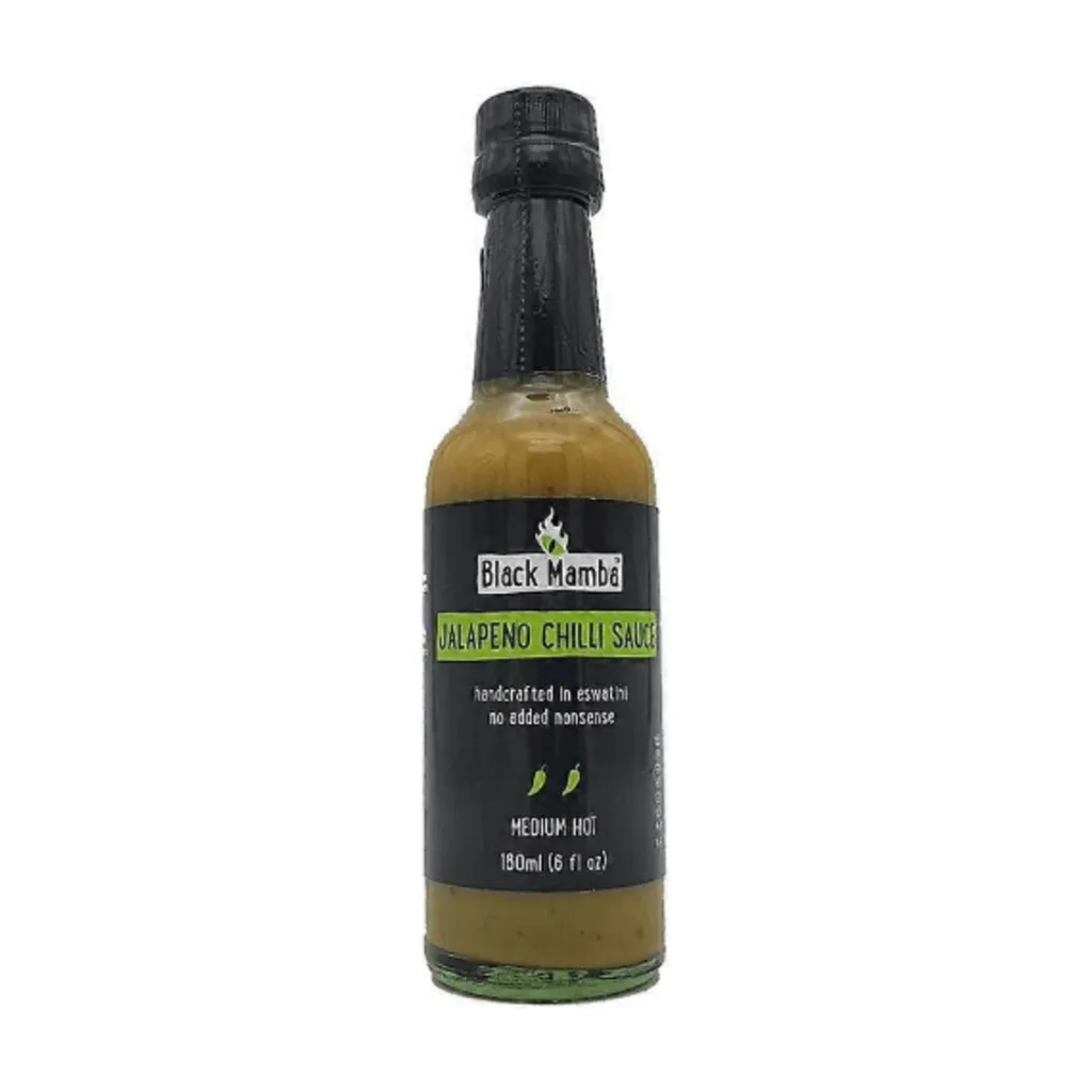 Black Mamba Jalapeño Chilli Sauce is a zesty, medium-heat sauce made with fresh green jalapeños. Packed with flavor and a tangy bite, it’s perfect for tacos, burgers, or adding a mild kick to your favorite dishes.