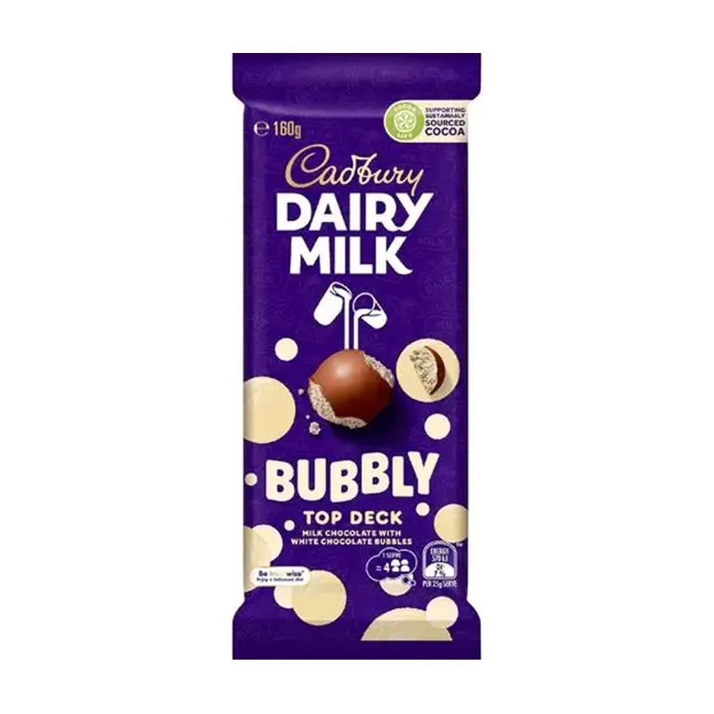 Cadbury Bubbly Top Deck is a light and airy chocolate bar with a bubbly milk chocolate base topped with a smooth layer of creamy white chocolate. It’s a playful, melt-in-your-mouth treat with a delicious blend of textures and flavors.