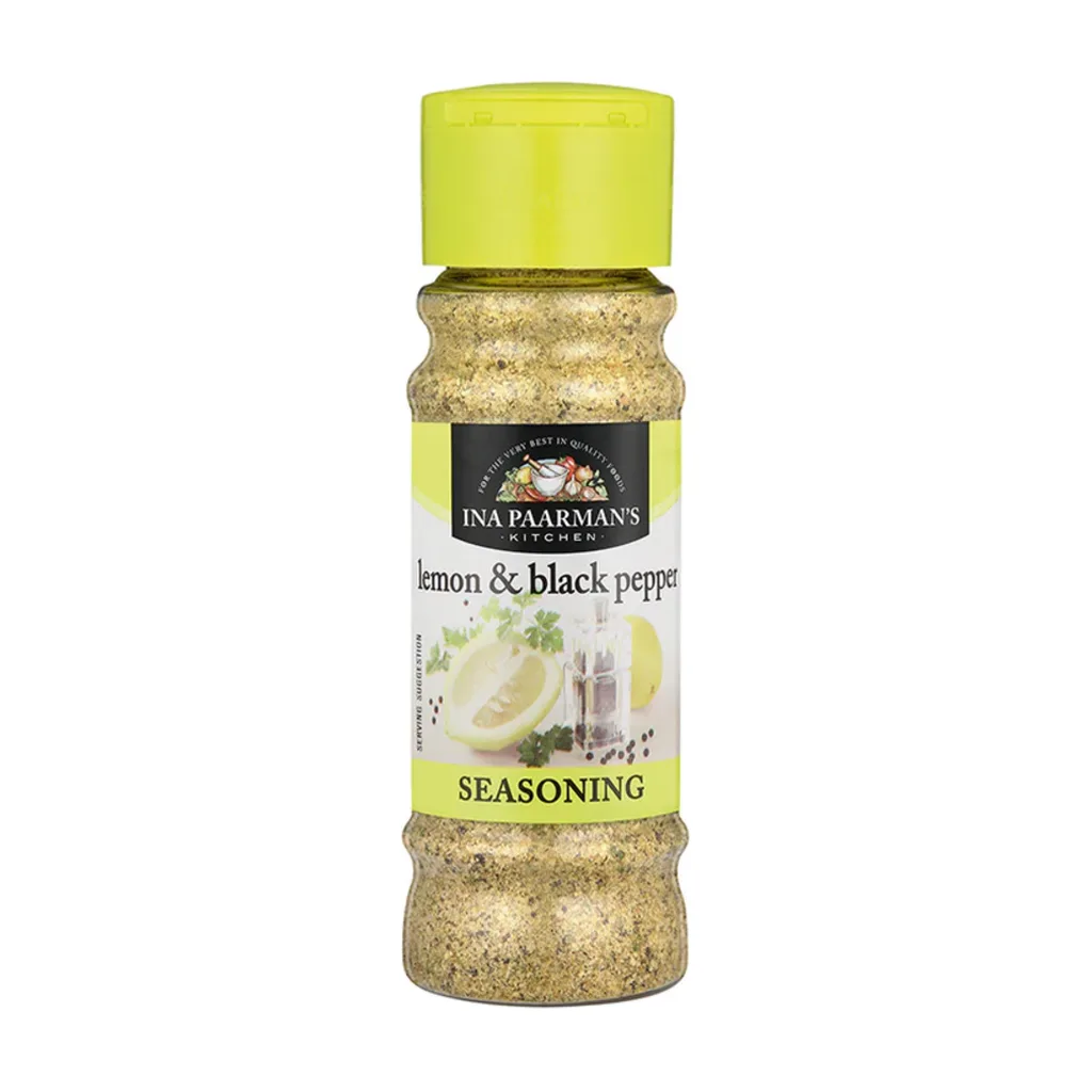 Ina Paarman’s Lemon & Black Pepper is a vibrant seasoning that combines zesty lemon and cracked black pepper for a fresh, tangy kick.