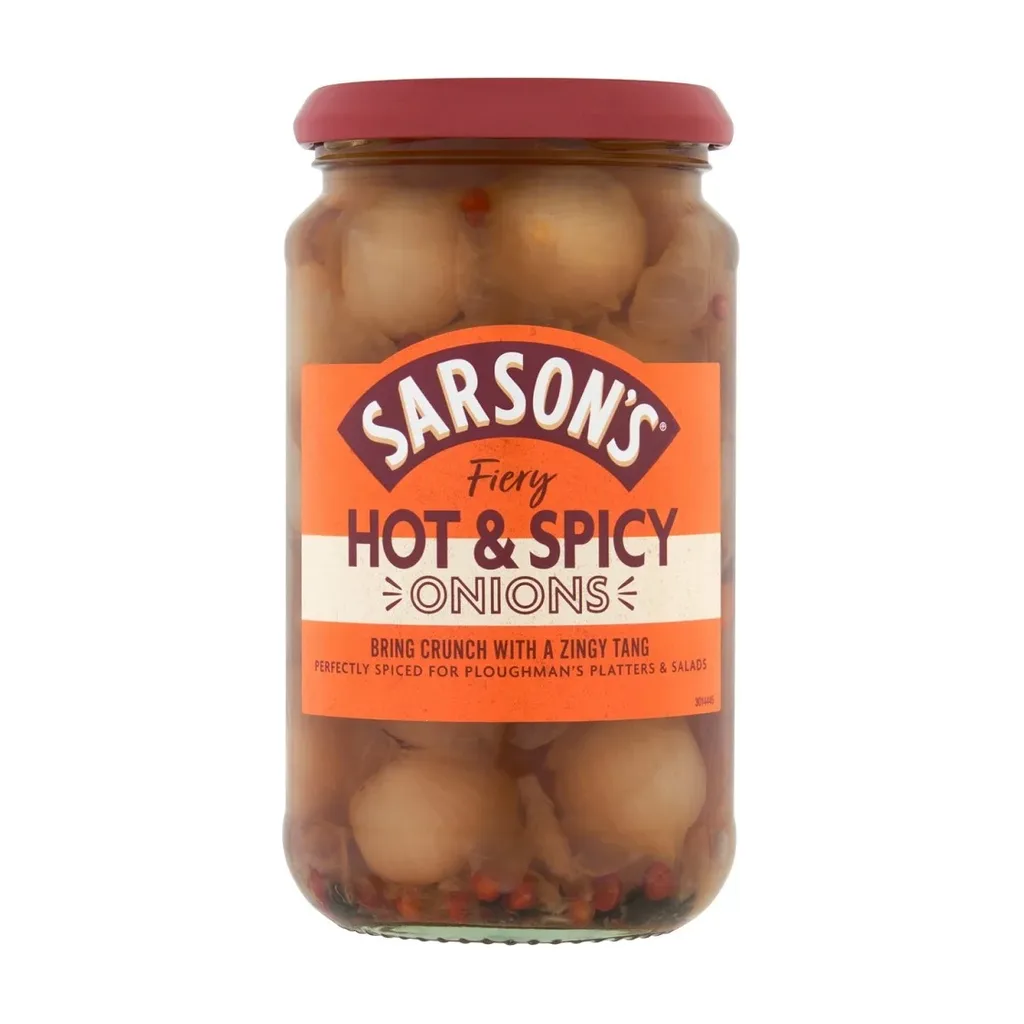 Sarsons Hot & Spicy Silverskin Onions (460g Jar) Plump silverskin onions pickled in Sarsons’ signature vinegar blend with chili, peppercorns, and spices. These fiery onions deliver a bold kick, making them perfect for cheese boards, ploughman’s lunches, BBQ spreads, or as a tangy snack straight from the jar.